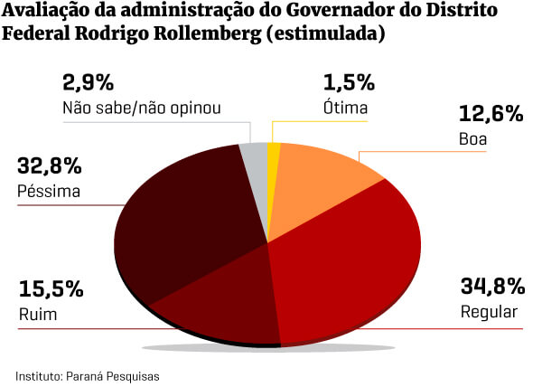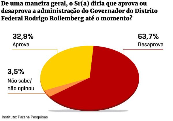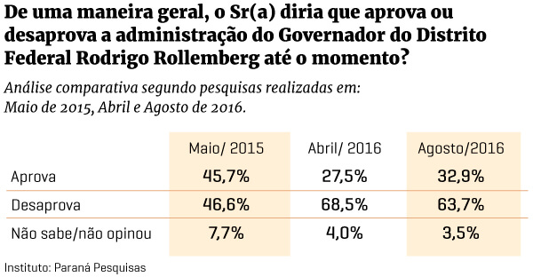 Esses percentuais estão longe de demonstrar a satisfação do cidadão candango com a condução do governo, mas apresentam uma melhora em relação aos dados de abril de 2016, quando o índice de aprovação desceu a 27,5%. Da mesma forma, o grau de desaprovação também recuou: de 68,5% para 63,7% nos meses analisados.