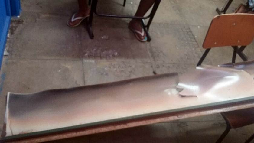Uma placa no teto de uma das salas da Escola Classe 59, em Ceilândia, caiu em cima de uma mesa utilizadas pelos alunos, em horário de aula, após as chuvas da tarde desta quarta-feira (5/10). Segundo informações de funcionários do colégio, o material quase atingiu um dos estudantes, que havia sido trocado de lugar minutos antes pela professora, por conta das gotas de água que caiam em cima da cadeira dele.