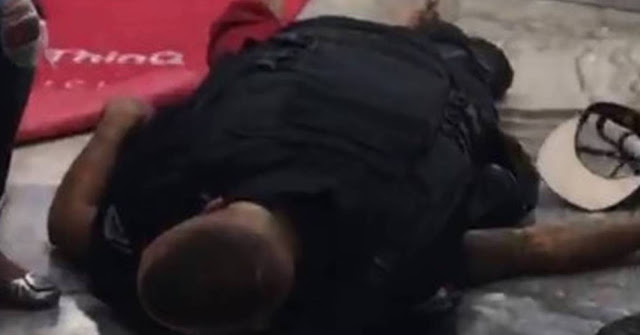 Testemunhas registraram o momento em que o segurança imobilizou o rapaz. REPRODUÇÃO/REDES SOCIAIS