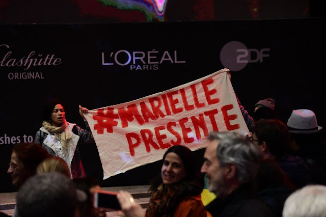 O grupo lembrou ainda a morte de Marielle Franco. Da Potsdamer Platz, os manifestantes caminharam em direção ao palácio da Berlinale, para aguardar a chegada do elenco ao tapete vermelho.