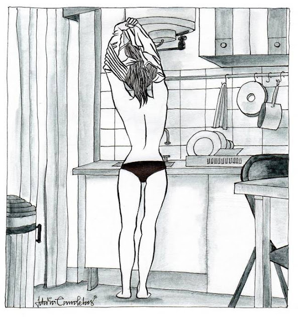 A série chama-se “Solidão pós-moderna”, mas nas ilustrações a solidão que Idalia refere é algo bom: mulheres com sensação de liberdade, desfrutando das suas casas, deitadas na cama ou a lavar a louça em lingerie, com expressões de tranquilidade e confiança.