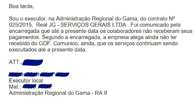 Agora o governo do PS(D)B no Distrito Federal penaliza os trabalhadores terceirizados da Administração Regional do Gama e da Subsecretaria de Proteção e Defesa Civil. Segundo os executores dos contratos da Real JG - Serviços Gerais Ltda nos dois órgão do GDF, os funcionários da empresa estão sem receber os salários de julho, que deveriam ter sido pagos no último dia 7.