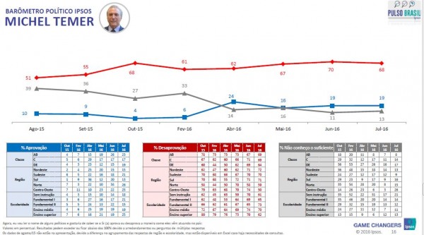 De acordo com a pesquisa de Ipsos, a aprovação a Michel Temer não se alterou, permanecendo em julho com os mesmos 19% obtidos em junho. Já o percentual dos que reprovam o peemedebista retraiu 2% em relação ao mês anterior. A avaliação sobre Dilma melhorou no mês de julho. A taxa dos que aprovam a presidenta afastada ficou em 25% e mostra melhora de 5 pontos percentuais em relação a junho. Seu índice de desaprovação caiu de 75% em junho para 71% em julho.