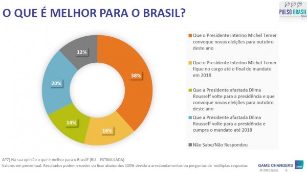 Os percentuais são referentes à questão “O que é melhor para o Brasil?”, em que quatro alternativas foram dadas aos entrevistados: “Que o presidente interino Michel Temer fique no cargo até o final do mandato em 2018”; “Que a presidenta afastada Dilma Rousseff volte para a Presidência e cumpra o mandato até 2018”; “Que o presidente interino Michel Temer convoque novas eleições para outubro deste ano”; e “Que a presidenta afastada Dilma Rousseff volte para a Presidência e convoque novas eleições para outubro deste ano”.