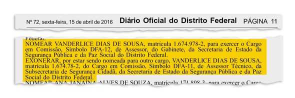 Agora, no entanto, Vanderlice dá expediente na pasta da ex-patroa. Ela foi nomeada servidora comissionada, com gratificação DFA-12. O ato administrativo foi publicado na edição do Diário Oficial do DF (DODF) de 15 de abril. Desde então, Vanderlice atua como assessora do gabinete de Márcia, das 14h às 20h. Na função, ela atende telefonemas e recebe visitantes, entre outras funções.
