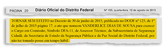 No primeiro caso, em agosto de 2015, ela seria lotada na Subsecretaria de Segurança Cidadã, na época em que Márcia chefiava o departamento. Entretanto, não conseguiu tomar posse. Oficialmente, a nomeação foi tornada sem efeito porque Vanderlice não assumiu o cargo em tempo hábil. Naquele período, ainda lhe faltava a escolaridade mínima necessária, o ensino médio. Em 23 de março deste ano, houve uma nova tentativa. Vanderlice foi nomeada novamente para o mesmo cargo, mas também não entrou em exercício.