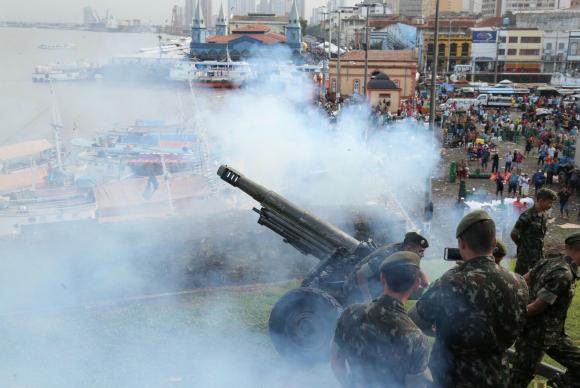 | O início das comemorações foi às 6h da manhã, no Forte do Presépio, com disparo de quatro tiros de canhão Secretaria de Comunicação de Belém/Divulgação |