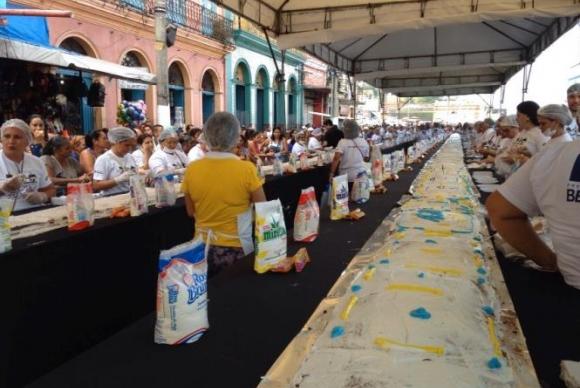 | O bolo de 100 metros para os 400 anos de Belém tinha recheio de frutas típicas da Amazônia Secretaria de Comunicação de Belém/Divulgação |