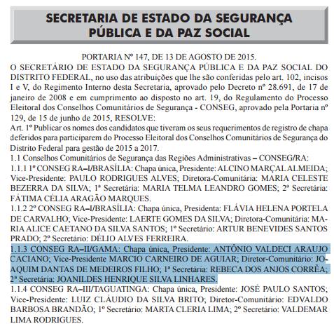 Foi publicada nesta sexta-feira (14) no Diário Oficial do Distrito Federal, DO/DF, a relação com os nomes dos candidatos que tiveram os seus requerimentos de registro de chapa deferidos para participarem do Processo Eleitoral dos Conselhos Comunitários de Segurança do Distrito Federal, Conseg, para a gestão de 2015 a 2017.