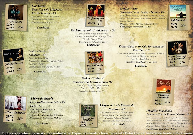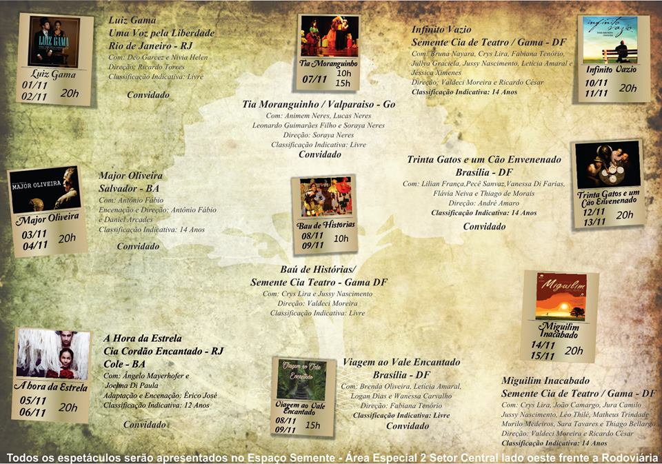 Os temas dos espetáculos são variados, que contemplarão os mais diversos e diletos gostos. Todos os espetáculos serão apresentados no Espaço Semente, Área Especial 2, setor Central, lado Oeste, frenta a Rodoviária do Gama.