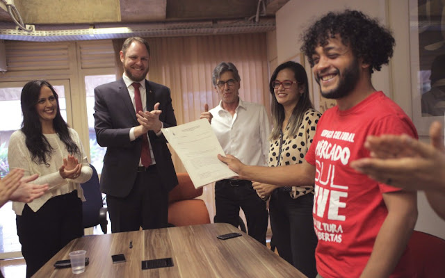 Durante a leitura do documento, realizada por Guilherme Reis, o secretário legitima as ações promovidas no território do Mercado Sul e reconhece a ampla relevância de seu fazer cultural, com especiais recortes na produção de cultura popular, economia criativa, economia solidária e cultura digital.