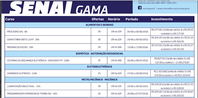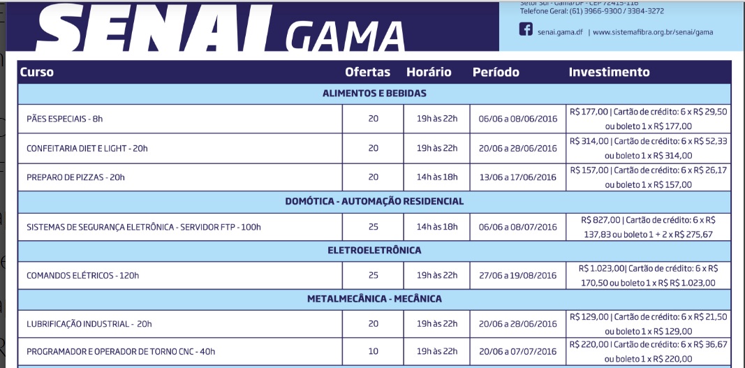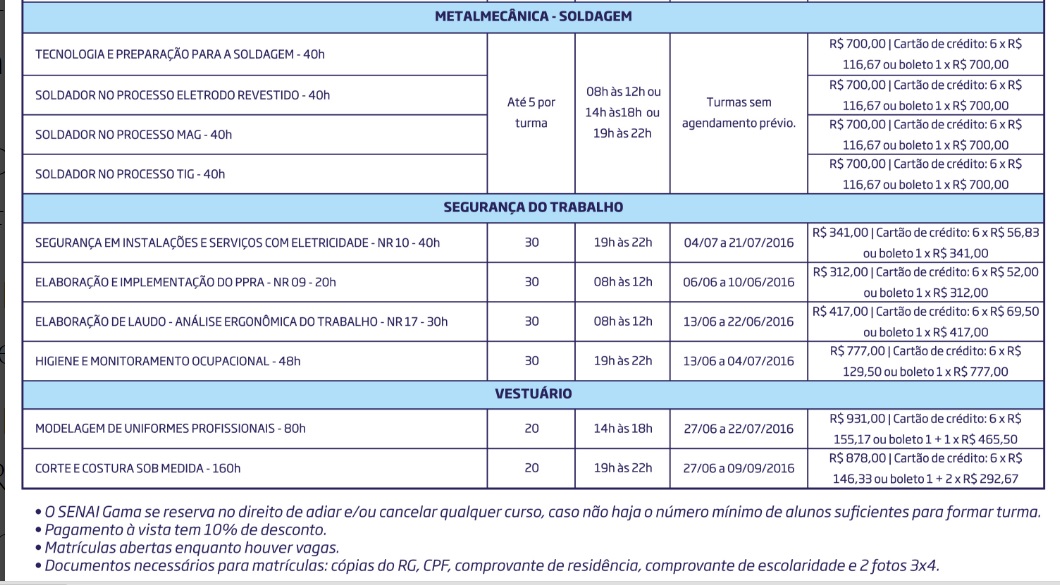 junio 5, 2016 20:21O Senai Gama está com matrículas abertas para 17 cursos nas áreas de conhecimento de Alimentos e Bebidas, Domótica – Automação Residencial, Eletroeletrônica, Metalmecânica nas áreas de Mecânica e de Soldagem, Segurança do Trabalho e Vestuário.