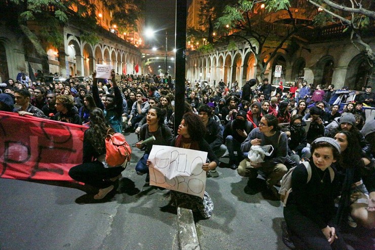 Leio no Mídia Ninja, deliciado, um post com as palavras seguintes: “Porto Alegre é grelo duro contra o golpe!” Vejo a foto, linda, que está sob uma luz de rara beleza, mergulhada em uma atmosfera de intima coesão, ampliada ainda pela ressonância oferecida pelos arcos em torno. E vejo, em primeiro plano na imagem, uma jovem que segura um cartaz, bem no centro da cena, com duas palavras apenas: GRELO DURO.