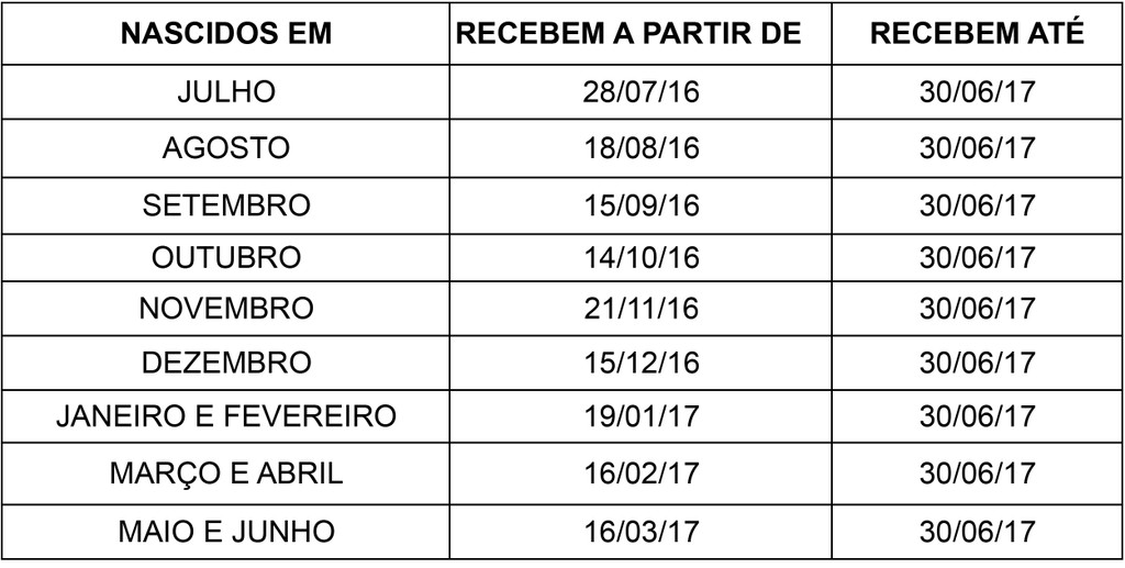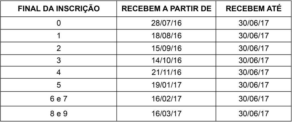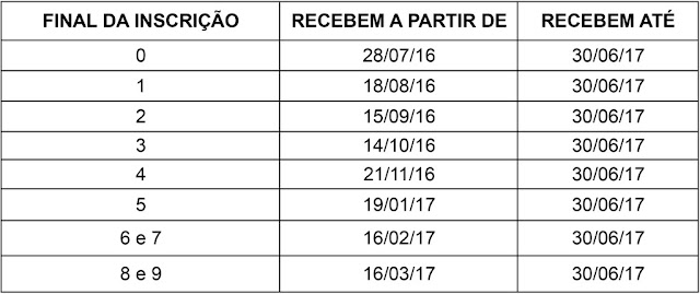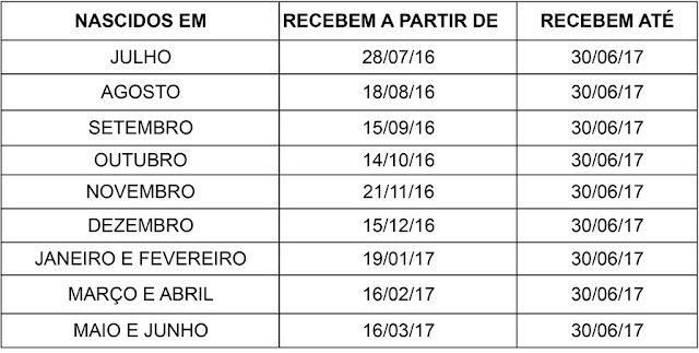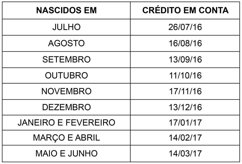I - O crédito em conta para correntistas da CAIXA será efetuado a partir de julho/2016 conforme tabelas abaixo: