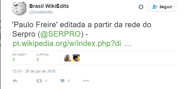 June 29, 2016 16:14Um grupo que monitora alterações feitas em páginas da Wikipedia a partir de redes governamentais identificou edições e alterações no artigo sobre o educador Paulo Freire na Wikipedia realizadas na tarde de nesta terça-feira (28) a partir de da rede do Serviço Federal de Processamento de Dados (Serpro).