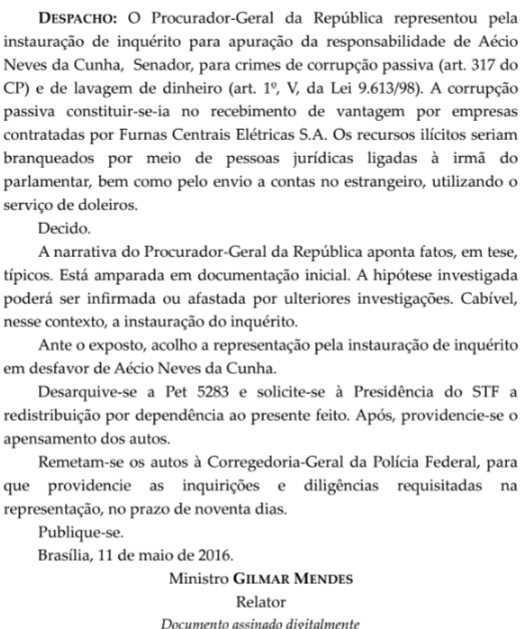 O ministro do Supremo Tribunal Federal (STF) Gilmar Mendes determinou, nesta quarta-feira (11/5), a instauração de inquérito contra o senador Aécio Neves (PSDB-MG). O magistrado atende pedido do procurador-geral da República, Rodrigo Janot. As informações são do site O Antagonista.