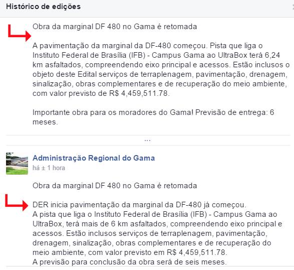 Meia hora depois a Administradora postou em sua página pessoal do Facebook, uma foto dela com o presidente do DER com um agradecimento pela agilidade na pavimentação da via marginal. Em seguida, todos os meios de comunicação utilizados pela Administração tiveram a notícia editada, acrescida da sigla DER.