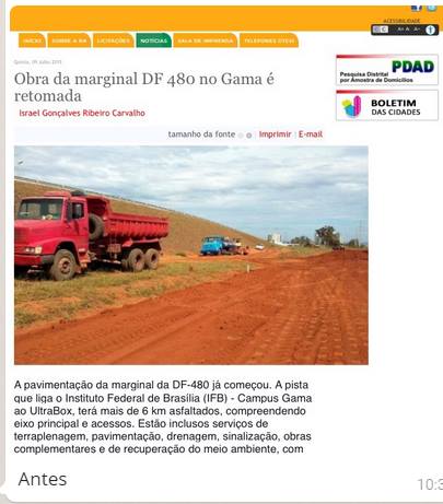 O Departamento de Estradas e Rodagens, DER, iniciou a pavimentação de uma via marginal à DF 480 no Gama, entretanto, a Administração Regional do Gama noticiou o fato sem citar que quem está tocando a obra é o DER, dando a entender aos mais desavisados que é uma realização da própria Administração Regional.