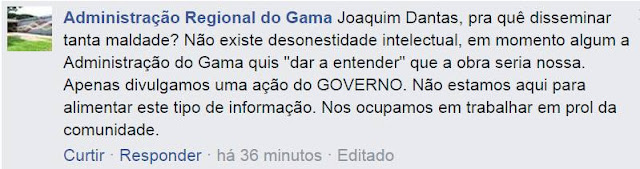 A Assessoria de Comunicação da Administração do Gama mandou-me uma mensagem, em resposta à uma crítica que fiz nas redes sociais, em que dizia que "Joaquim Dantas, pra quê disseminar tanta maldade? Não existe desonestidade intelectual, em momento algum a Administração do Gama quis "dar a entender" que a obra seria nossa. Apenas divulgamos uma Ação do GOVERNO. Não estamos aqui para alimentar este tipo de informação. Nos ocupamos demais para trabalhar em prol da comunidade".