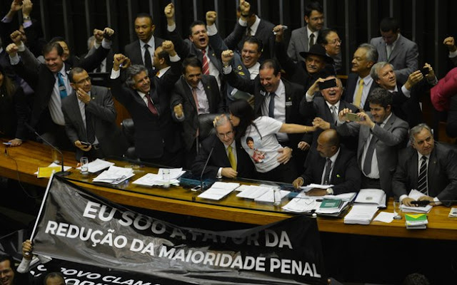 Para comemorar a aprovação da PEC que propõe a redução da maioridade penal, deputada senta no colo de Cunha