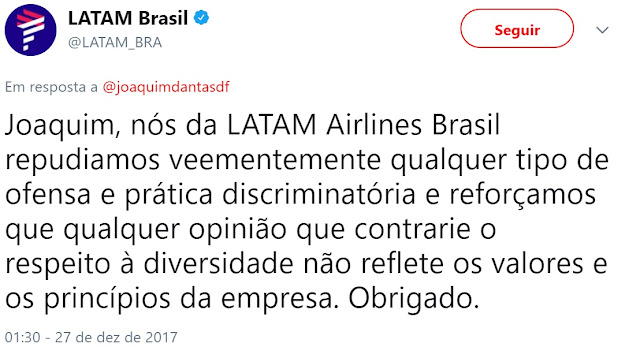 Na nota, que foi publicada no Twitter, a empresa aérea afirma que "Joaquim, nós da LATAM Airlines Brasil repudiamos veementemente qualquer tipo de ofensa e prática discriminatória e reforçamos que qualquer opinião que contrarie o respeito à diversidade não reflete os valores e os princípios da empresa. Obrigado".