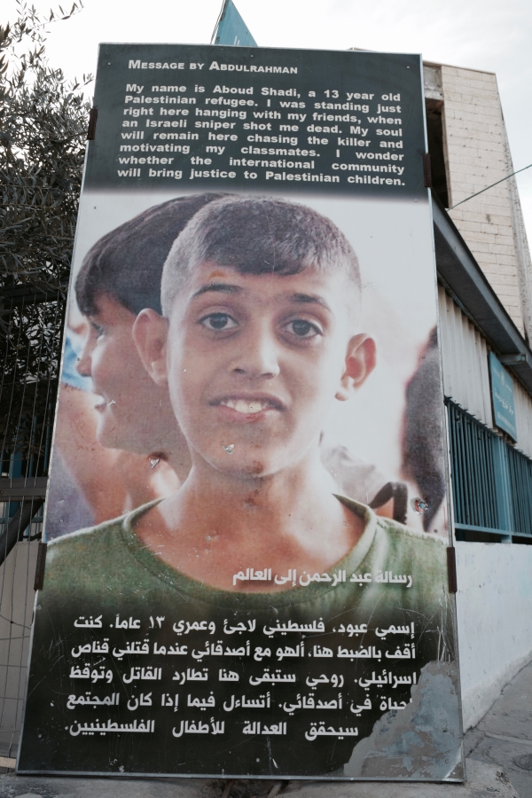 Uma placa metálica com a foto de um menino magro decora a entrada do campo de refugiados de Aida, em Belém (Cisjordânia). Um texto curto explica, em inglês e árabe, que o garoto franzino era Aboud Shadi, apelido de Abed Al-Rahman Shadi Obeidallah. Ele foi assassinado por um soldado israelense no dia 15 de outubro de 2015, exatamente naquele local, quando tinha 13 anos. Aboud Shadi conversava com amigos.