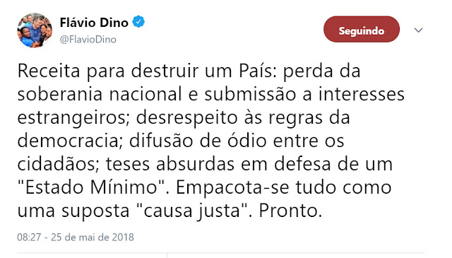 Ao comentar sobre as paralisações dos caminhoneiros que gerou uma crise de abastecimento no país, o governador do Maranhão, Flávio Dino (PCdoB) lamentou a destruição do Brasil e responsabilizou a falta de legitimidade de Temer e seu governo de insubordinação ao capital internacional pela situação de caos deixada, declarou no Twitter.