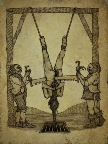 Agora imaginem ser serrado ao meio lentamente? Essa técnica de tortura foi muito utilizada para matar pessoas acusadas de bruxaria, adultério, assassinato e blasfêmia. Nessa prática, dois torturadores amarravam as pessoas de cabeça para baixo a fim de deixar todo o sangue fluir, depois disso, pegavam uma serra e atravessavam as vítimas começando pelo meio das pernas, o que levava algumas horas até a vítima morrer. Essa tortura também era usada para ameaçar os acusados, colocando seus familiares nos dentes afiados da serra.