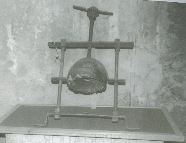Altamente usado durante a Inquisição Espanhola, o Esmaga cabeças, como ficou conhecido, era capaz de causar dores e danos irreparáveis. O instrumento consistia em um capacete ligado à uma barra onde se apoiava o queixo da vítima. Depois disso, o parafuso apertava o capacete comprimindo a cabeça da vítima.
