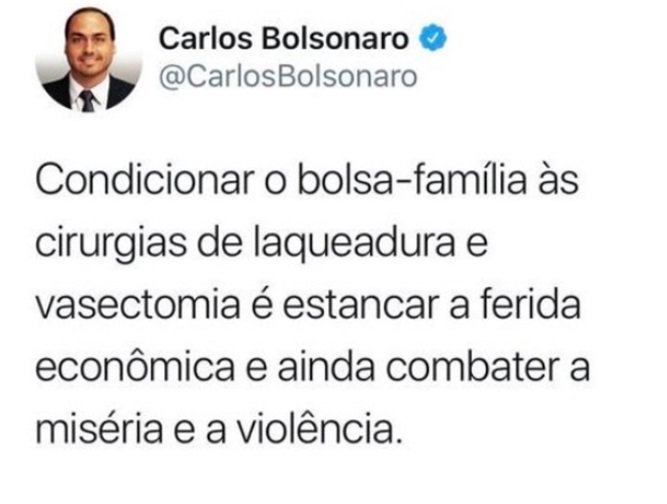 Novembre 28, 2018 9:56Pelo Twitter, o vereador pelo PTB carioca Carlos Bolsonaro, filho de Jair Bolsonaro, pregou que o Bolsa Família só seja concedido a casais pobres que topem fazer laqueadura de trompas ou vasectomia. O vereador nazista não informou se apenas o homem ou apenas a mulher podem ser esterilizados à força para fazer jus ao benefício.