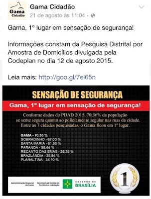 A Administração Regional do Gama segue a mesma receita, incluindo em seus quadros de funcionários jornalistas que só publicam em seus veículos de comunicação o que o governo manda. A mais recente foi a divulgação de uma pesquisa onde aponta que a população do Gama detém o maior índice de sensação de segurança, cerca de 70% da população.