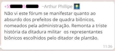 Segundo Arthur "Não vi este fórum se manifestar quanto ao absurdo dos prefeitos de quadra biônicos, nomeados pela administração. Remonta a triste história da ditadura militar os representantes biônicos escolhidos pelo ditador de plantão" disse o internauta.