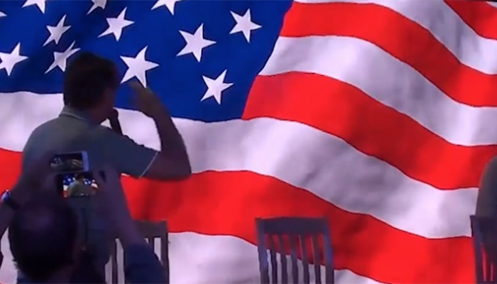 E depois, de maneira tosca, prestando continência à bandeira norte-americana — tosca e ilegal, pois só se presta o gesto a bandeira estrangeira em ato oficial.