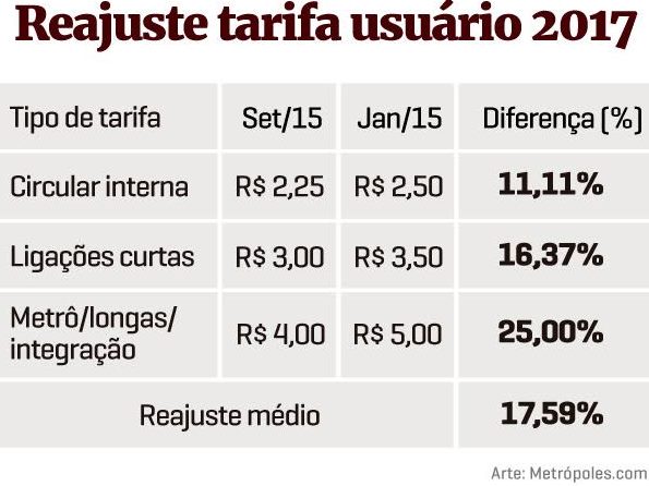 O reajuste chega a 25%, no caso das passagens do metrô e das linhas de longa distância. O índice está bem acima da inflação acumulada entre setembro de 2015 e novembro deste ano (último porcentual divulgado pelo IBGE). No período, o IPCA brasiliense ficou em 7,69%.