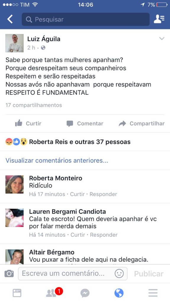 “Sabe porque (sic) tantas mulheres apanham? Porque desrespeitam seus companheiros. Respeitem e serão respeitadas. Nossas avós não apanhavam porque respeitavam. Respeito é fundamental”, dizia a postagem, que foi apagada.
