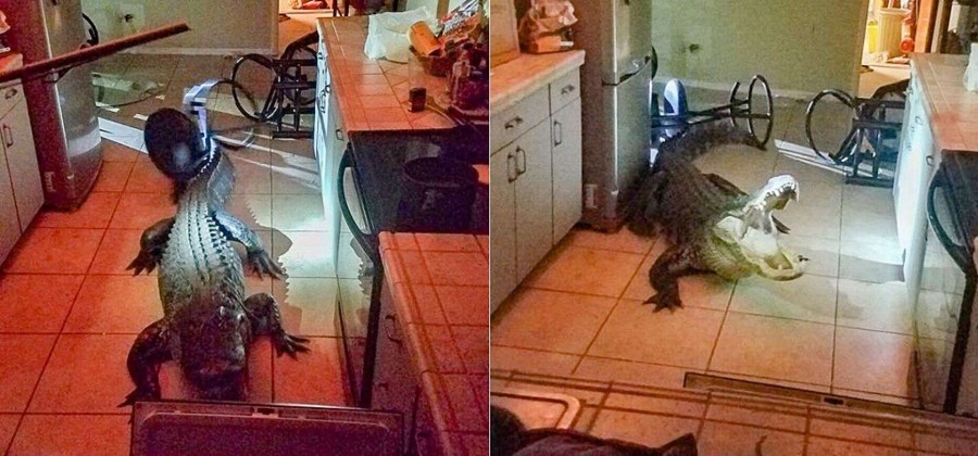 июня 5, 2019 14:55Algumas pessoas surtam apenas com uma barata voando na sala. Agora imagine, você levantar de madrugada para beber água e encontrar um jacaré na sua cozinha casa? E não estamos falando de um filhote de jacaré. E sim de um aligátor (jacaré americano) de três metros de comprimento, que fez um real estrago na casa. O jacaré possivelmente adentrou o imóvel através da janela. O animal derrubou os móveis, fez uma bagunça e até quebrou garrafas de vinho.
