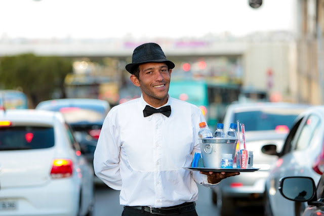 De gravata borboleta, ambulante ganha a vida vendendo água no semáforo