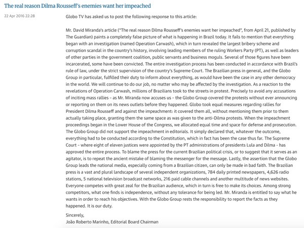 O artigo de Miranda, intitulado “A razão real por que os inimigos de Dilma Rousseff querem seu impeachment”, lembra que “a maioria dos grandes grupos de mídia atuais – que aparentam ser respeitáveis para quem é de fora – apoiaram o golpe militar de 1964 que trouxe duas décadas de uma ditadura de direita e enriqueceu ainda mais as oligarquias do país”.
