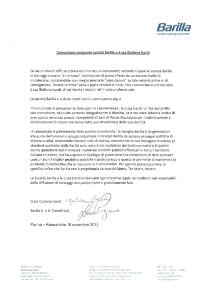 Sul sito di Barilla c'è una pagina di smentita specifica che include una dichiarazione congiunta, datata 16 novembre, di Barilla e della dottoressa Giuliana Icardi, il cui nome compariva nell'appello-bufala e gli conferiva apparente credibilità.