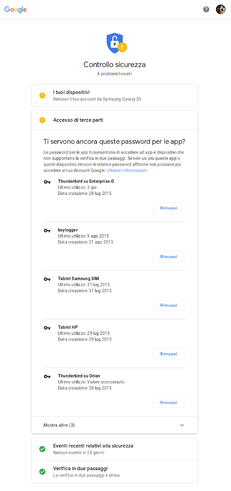 Per aiutarvi a tenere traccia di questi dispositivi e della sicurezza generale del vostro account c’è una pagina apposita di Google, myaccount.google.com/security-checkup, dove potete vedere quali dispositivi sono autorizzati ma inutilizzati e quali app hanno accesso ai vostri dati.