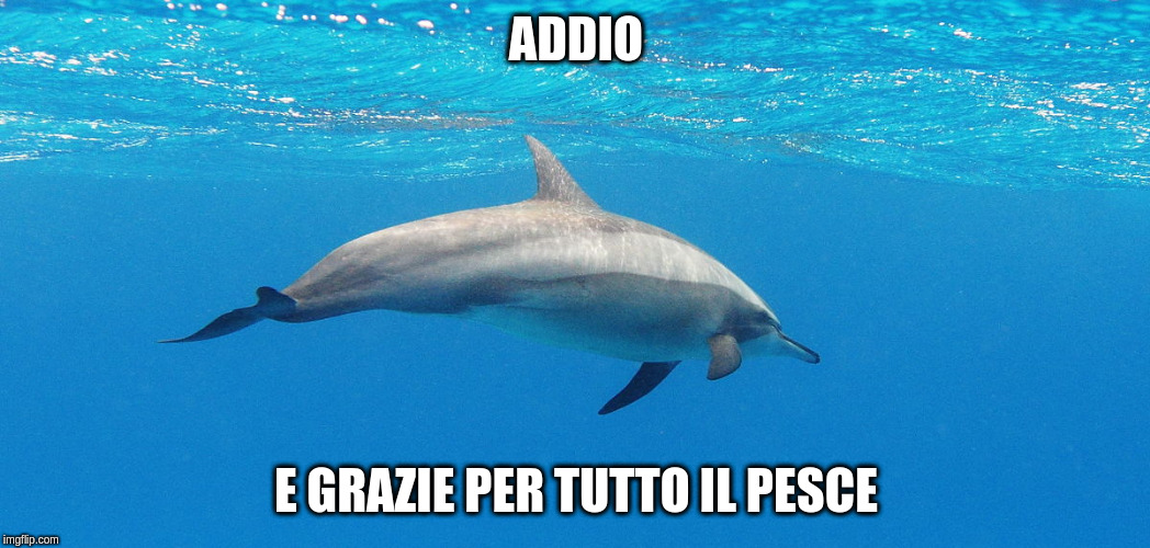 Se non fosse sufficientemente chiaro, quindi, so benissimo che il delfino non è un pesce: il pesce citato nel meme è quello che i delfini hanno mangiato ricevendolo dagli umani. E dire a qualcuno “Addio, e grazie per tutto il pesce” significa “Nonostante miei ripetuti tentativi di comunicare e spiegarti le cose, la tua boria e la tua stupidità ti impediscono di capire che cosa ti sto dicendo e quindi è inutile che io ti dedichi tempo. Anche se ti sembra impossibile, vivo benissimo e me la spasso anche senza di te e non sento il bisogno insopprimibile di dialogare con te. La conversazione è finita.”