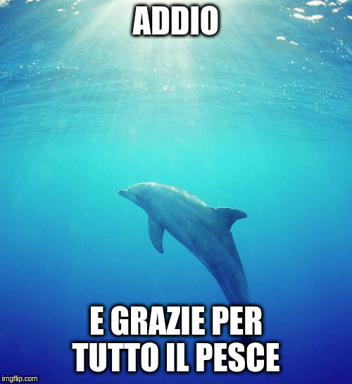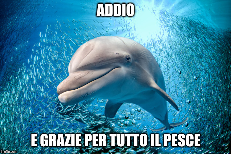 Se non fosse sufficientemente chiaro, quindi, so benissimo che il delfino non è un pesce: il pesce citato nel meme è quello che i delfini hanno mangiato ricevendolo dagli umani. E dire a qualcuno “Addio, e grazie per tutto il pesce” significa “Nonostante miei ripetuti tentativi di comunicare e spiegarti le cose, la tua boria e la tua stupidità ti impediscono di capire che cosa ti sto dicendo e quindi è inutile che io ti dedichi tempo. Anche se ti sembra impossibile, vivo benissimo e me la spasso anche senza di te e non sento il bisogno insopprimibile di dialogare con te. La conversazione è finita.”