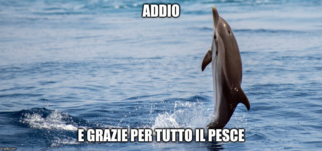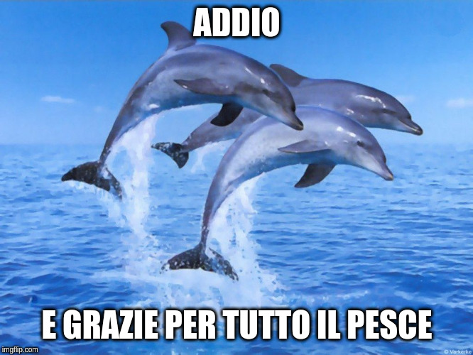 Se non fosse sufficientemente chiaro, quindi, so benissimo che il delfino non è un pesce: il pesce citato nel meme è quello che i delfini hanno mangiato ricevendolo dagli umani. E dire a qualcuno “Addio, e grazie per tutto il pesce” significa “Nonostante miei ripetuti tentativi di comunicare e spiegarti le cose, la tua boria e la tua stupidità ti impediscono di capire che cosa ti sto dicendo e quindi è inutile che io ti dedichi tempo. Anche se ti sembra impossibile, vivo benissimo e me la spasso anche senza di te e non sento il bisogno insopprimibile di dialogare con te. La conversazione è finita.”
