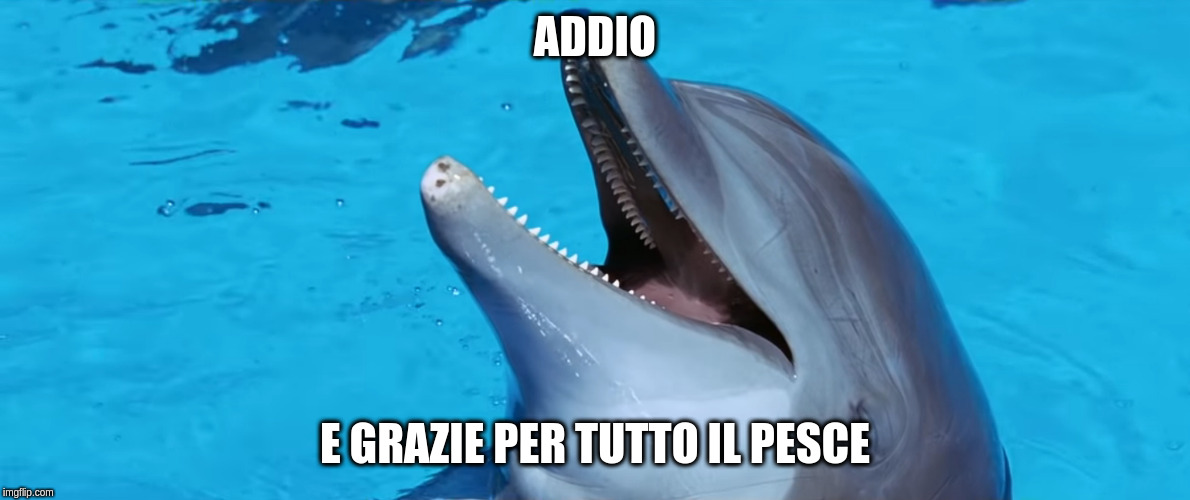 Se non fosse sufficientemente chiaro, quindi, so benissimo che il delfino non è un pesce: il pesce citato nel meme è quello che i delfini hanno mangiato ricevendolo dagli umani. E dire a qualcuno “Addio, e grazie per tutto il pesce” significa “Nonostante miei ripetuti tentativi di comunicare e spiegarti le cose, la tua boria e la tua stupidità ti impediscono di capire che cosa ti sto dicendo e quindi è inutile che io ti dedichi tempo. Anche se ti sembra impossibile, vivo benissimo e me la spasso anche senza di te e non sento il bisogno insopprimibile di dialogare con te. La conversazione è finita.”