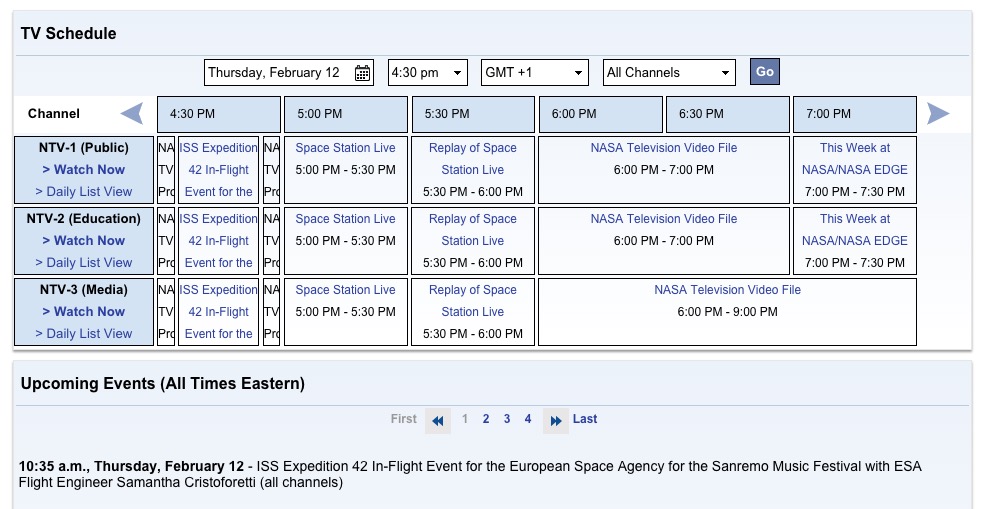 C'è infine la scaletta di NASA TV di oggi, che alle 10:35 am (ora della costa est degli Stati Uniti, le 16:35 italiane) aveva in programma l'intervista di Sam per Sanremo (grazie a ForumAstronautico per la segnalazione).