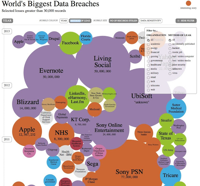 rappresentazione grafica dei 300 più grandi furti di dati digitali personali, riordinabili per cronologia, gravità e quantità e anche in base al metodo d’intrusione utilizzato.