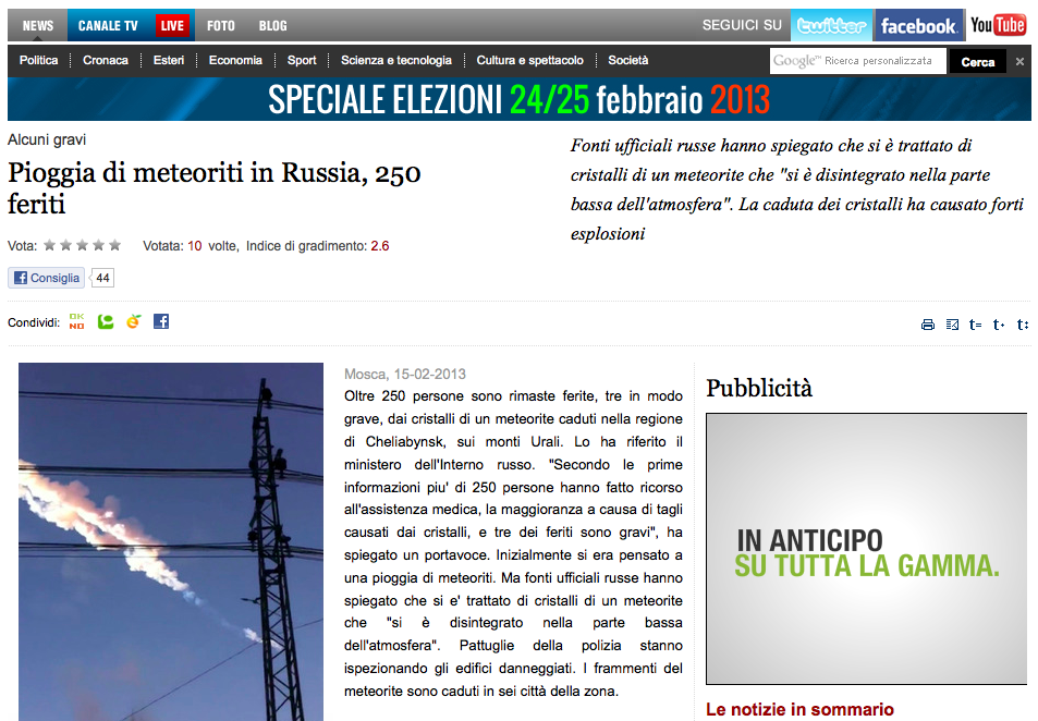 Arriva puntuale la rassegna di strafalcioni giornalistici intorno alla notizia di una meteora che ha solcato il cielo in Russia (chi stesse cercando informazioni tecniche può guardare questo articolo): secondo la Rai i feriti sarebbero stati causati dai “cristalli” della meteora (“Fonti ufficiali russe hanno spiegato che si è trattato di cristalli di un meteorite che "si è disintegrato nella parte bassa dell'atmosfera". La caduta dei cristalli ha causato forti esplosioni”), ma in realtà le lesioni sono state prodotte dai vetri infranti a causa dell'onda di pressione.