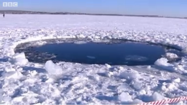 Un ottimo sunto della situazione è su Planetary.org; una notevolissima dimostrazione dell'uso degli strumenti di Internet (Google Earth e Youtube) e di un po' d'ingegno matematico per ricostruire la traiettoria della meteora è su OgleEarth.com. La cosa interessante è che questa ricostruzione sembra avvalorare la possibilità che il foro circolare nel lago Chebarkul (foto qui accanto; altre, con possibili frammenti, qui), largo una decina di metri, sia davvero stato causato da qualche frammento della meteora, dato che il lago sta proprio nelle vicinanze del punto terminale della traiettoria stimata.Un bel grafico chiarisce la terminologia: una cometa è un blocco di ghiaccio e roccia accompagnato da una coda; un asteroide è una roccia di grandi dimensioni che segue un'orbita; un meteoroide è una roccia più piccola di un asteroide (sotto i dieci metri) e i meteoroidi che raggiungono la superficie della Terra o di un altro corpo celeste sono meteoriti; la meteora è invece la scia luminosa visibile durante il rientro di un oggetto nell'atmosfera, e se la scia è molto luminosa si chiama bolide.