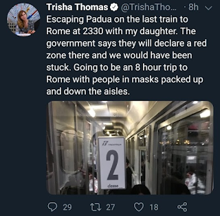 Chi ha scritto quel tweet non è una persona qualsiasi. È Trisha Thomas, della Associated Press, attuale presidente dell’associazione della stampa estera in Italia. Che fa esattamente il contrario di quello che va fatto per difendere se stessa, sua figlia e gli altri dal coronavirus: andare in posti affollati, stiparsi in un treno e portare in giro il contagio verso le regioni meno colpite.
