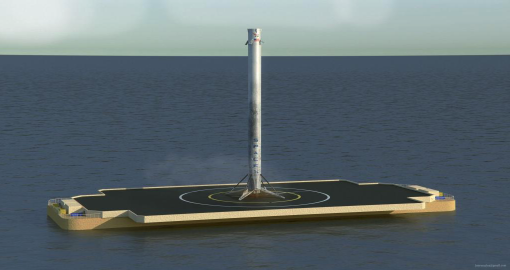 La chiatta, mostrata qui accanto in una vista dall'alto, ha una piattaforma di atterraggio di circa 90 per 50 metri: sembra tanto, ma non è banale rientrare dallo spazio a velocità ipersonica e centrare un campo di calcio da qualche parte nell'oceano a circa 180-250 miglia (300-400 km) al largo di Jacksonville, in Florida. La chiatta ha potenti motori di manovra che la tengono a punto fisso nonostante le correnti, ma il razzo è grande (è alto 46 metri e le zampe hanno un ingombro di 18 metri), come si vede in questa ricostruzione in scala, e la stabilizzazione della chiatta tramite GPS ha una tolleranza di circa tre metri; c'è poi il rischio di uno scivolamento sulla piattaforma e quello che l'oceano faccia salire e scendere l'intera chiatta.